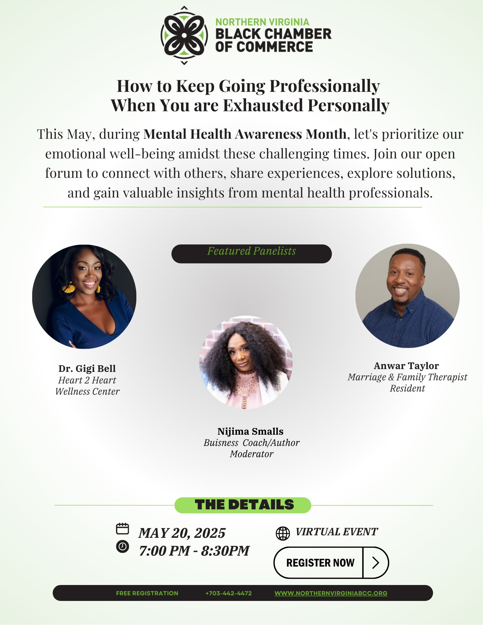 In honor of Mental Health Awareness Month, join the Northern Virginia Black Chamber of Commerce for a powerful and timely conversation prioritizing emotional well-being in the workplace. Connect with mental health professionals and peers to share experiences, explore solutions, and gain practical tools for balancing personal and professional life.