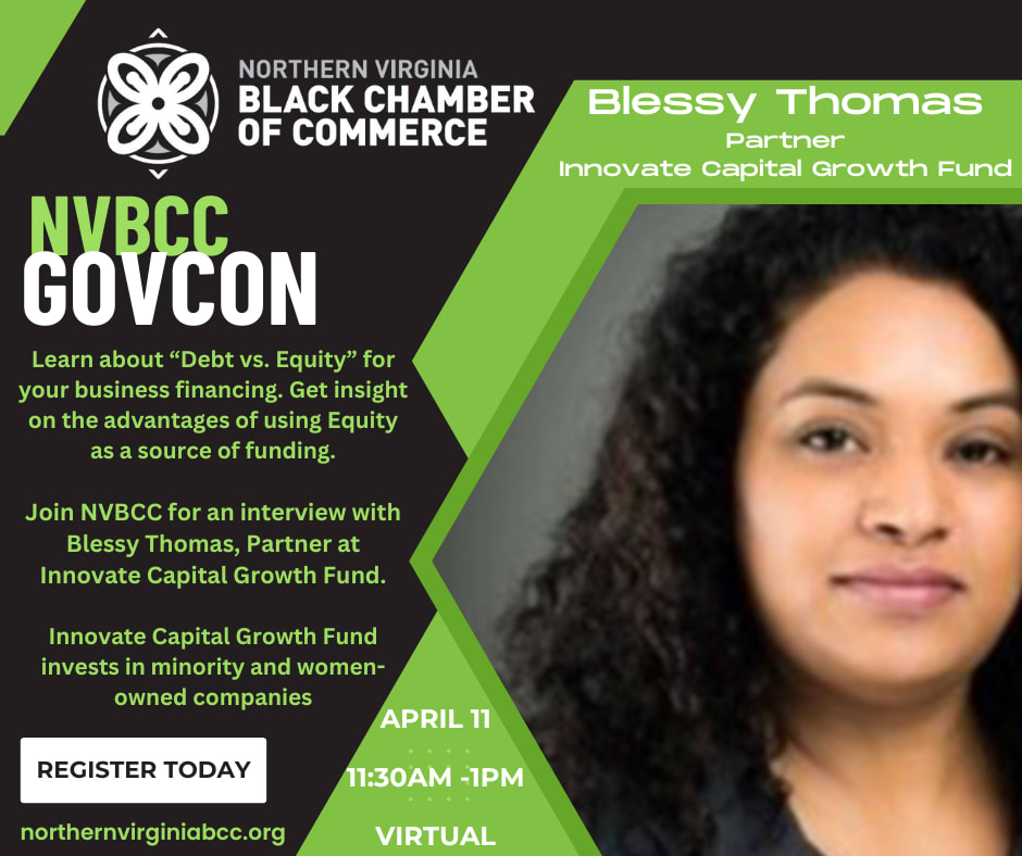 GovCon Online for the month of April will focus on Debt vs. Equity for business financing and highlight the advantages of using Equity as a source of funding. The presentation will be a collaboration between World One Investments and Innovate Capital, and the presenter is Blessy Thomas.