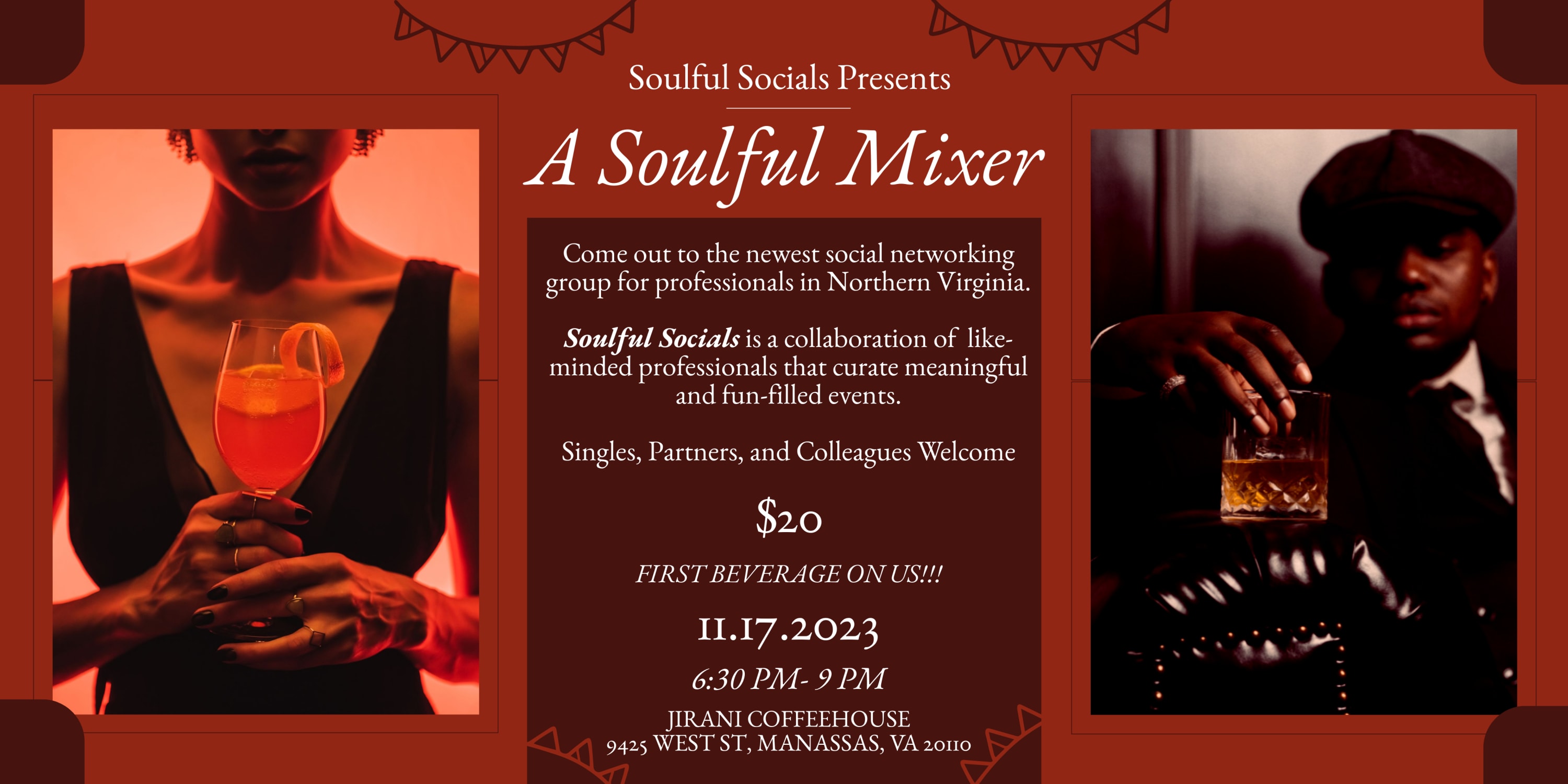 This mixer is for soulful professionals - singles, couples, and colleagues. Join us for a fun night of socializing and making connections, either business or personal, and learn about what Soulful Social events have to offer. Where: Jirani Coffeehouse, Manassas, VA When: Friday, November 17, from 6-10 p.m. Who: Soulful Professionals in NOVA Cost: $20 *includes a complimentary drink or food item on us! Soulful Socials is a collaboration of like-minded Black professionals that curate meaningful and fun-filled events for us by us in Northern Virginia. This event is brought to you by Loudoun Counseling & Coaching, Pure Flow Productions, Out The Box Productions, and Jirani Coffeehouse. * food or drink items up to $10