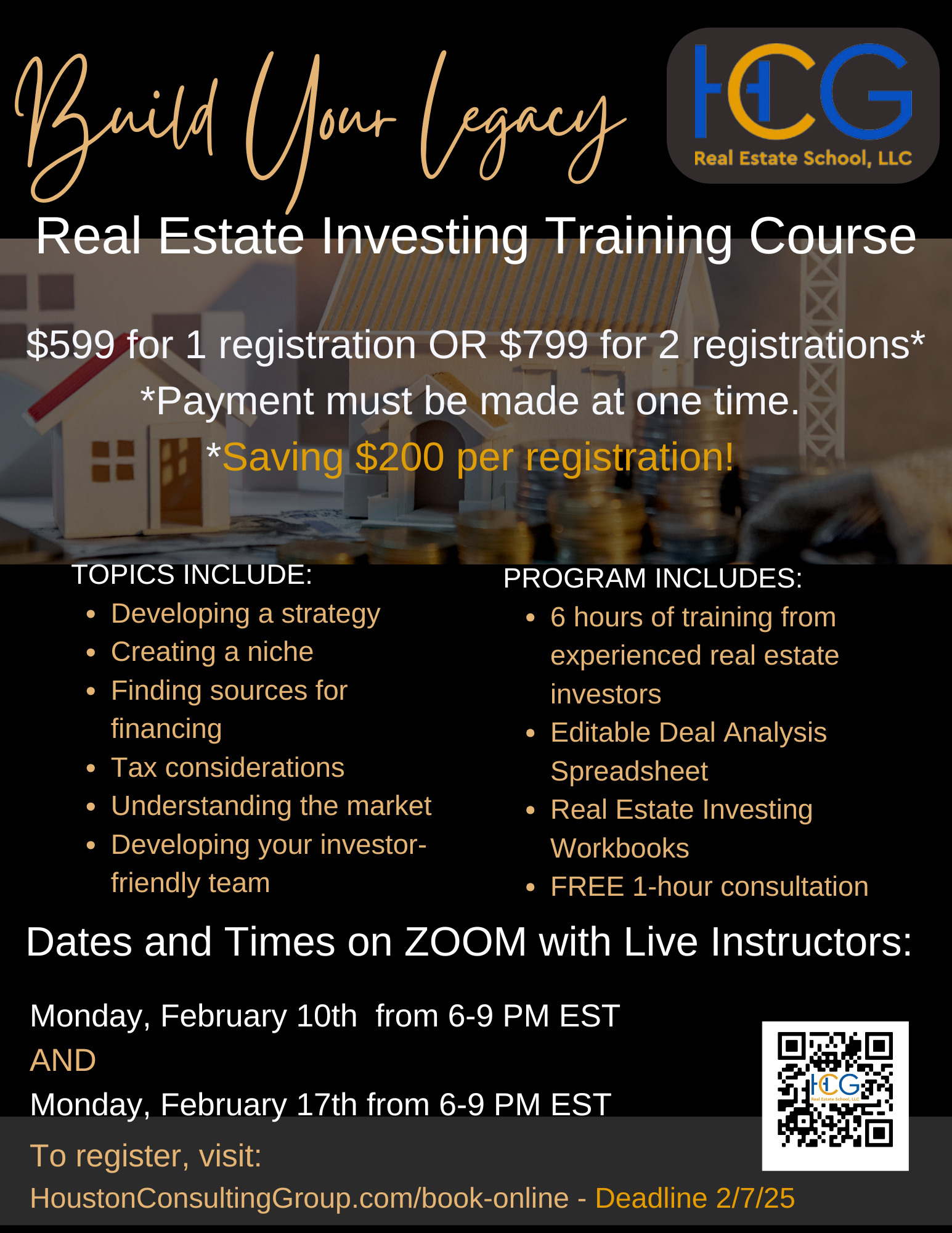 Registration is open for our Build Your Legacy Real Estate Investing Training Course starting February 10, 2025 on Zoom with live instructors! Taught by experienced real estate investors, this 6-hour intense training course by HCG Real Estate School will empower you with the education, resources, support you need to acquire your first or next profitable investment property with confidence. Session dates and times: Monday, February 10th from 6-9 PM EST and Monday, February 17th from 6-9 PM EST. Listen to the success story of one of our first-time investor students at: StudentSuccessStory