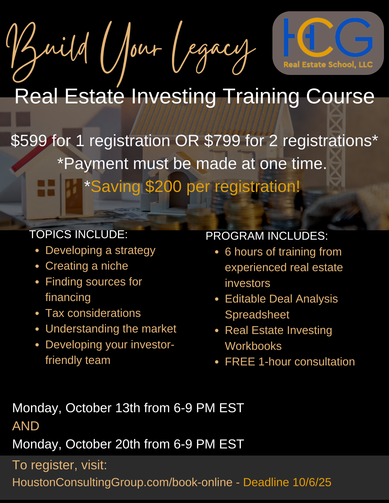 Registration is open for our Build Your Legacy Real Estate Investing Training Course starting October 13, 2025 on Zoom with live instructors! Taught by experienced real estate investors, this 6-hour intense training course by HCG Real Estate School will empower you with the education, resources, support you need to acquire your first or next profitable investment property with confidence.
