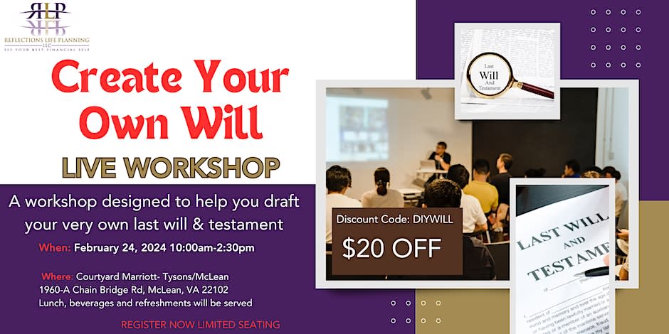 Have you been thinking about writing your last will and testament but are not sure where to start? The online platforms are cheap, but can you rely on them to get your wishes across the right way. Lawyers can get it done right but they can be so expensive! Our workshop will give you the best of both worlds! We will help you to create your own last will and testament, have an attorney licensed in your state to review it, and make sure that at the end of the workshop all of your wishes are written down and ready to go if anything happens to you. We will do this all for the fraction of what a consultation with a lawyer will cost you. We will also provide a delicious lunch and snacks throughout the day and answer any of your pressing questions! Come out and Create Your Own Will. Register to secure your spot: