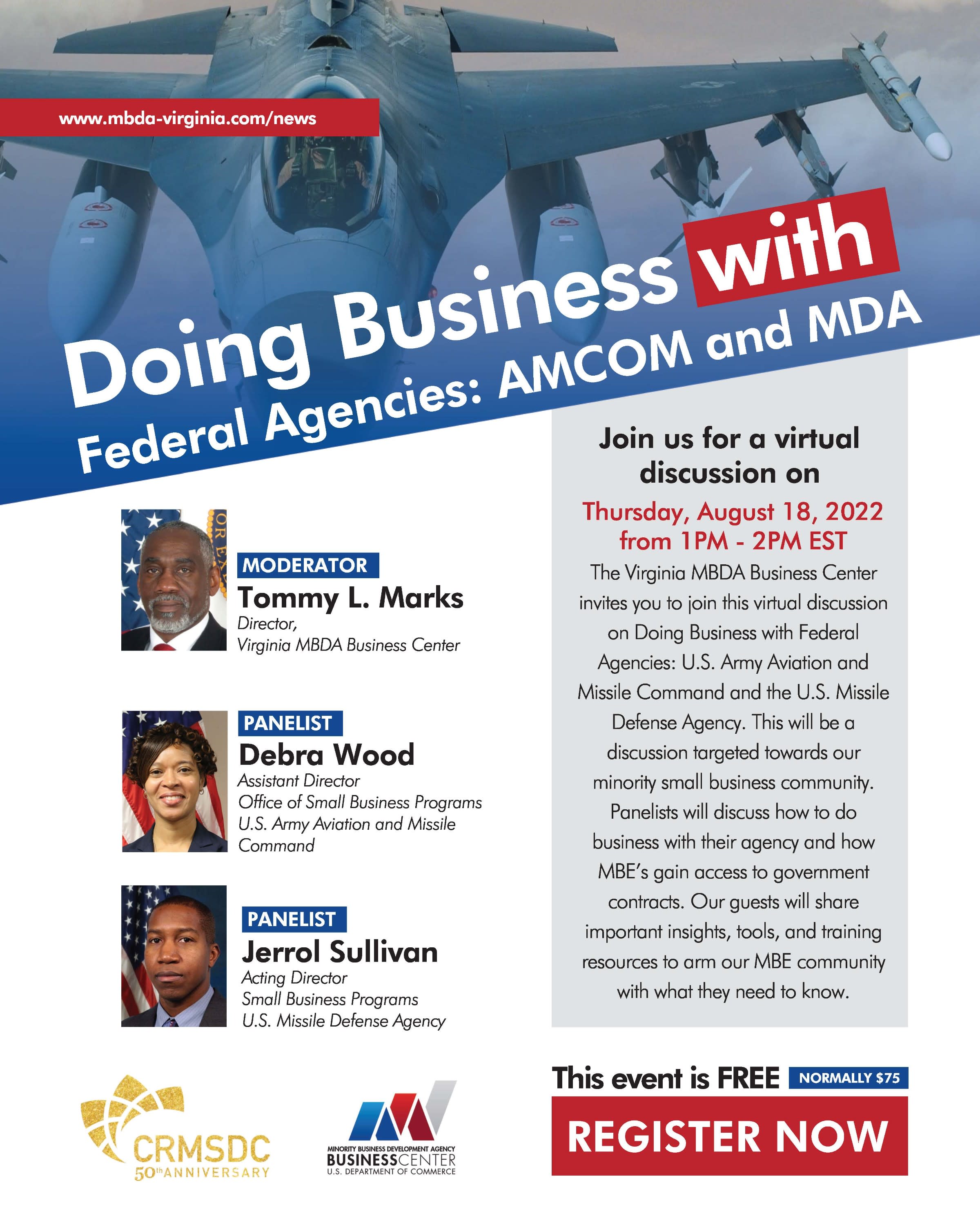 The Virginia MBDA Business Center invites you to join this virtual discussion on doing business with Federal Agencies: U.S. Army aviation and the U.S. Missile Defense Agency. This will be a discussion targeted towards our minority small business community. Panelists will discuss how to do business with their agency and how MBE's gain access to government contracts. Guests will share important insights, tools, and training resources to arm our MBE community with what they need to know.