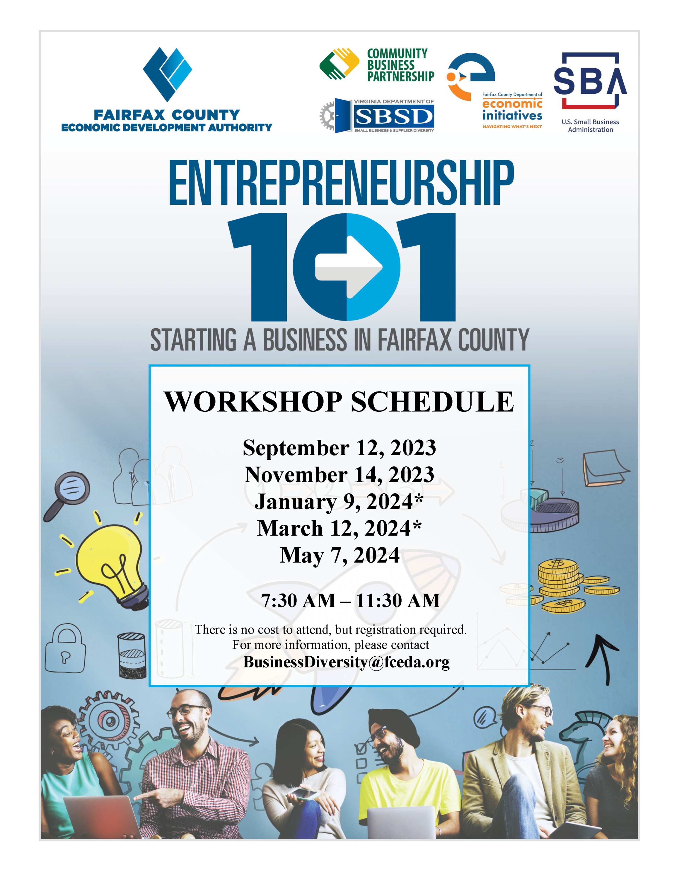 Aspiring Entrepreneur? Small Business Start-Up? Join our panel of small business experts for an interactive in person workshop on how to start your business. We will provide you with step-by-step information that will cover registering your business, permitting requirements, business feasibility and business plan basics, business certifications, financing options and government resources. Presented by the Fairfax County Economic Development Authority (FCEDA), in partnership with the Virginia Department of Small Business and Supplier Diversity (SBSD), Community Business Partnership (CBP), Women's Business Center of Northern Virginia, U.S. Small Business Administration (SBA), and the Fairfax County Department of Economic Initiatives (DEI). This course will provide the business fundamentals needed to successfully start a business!