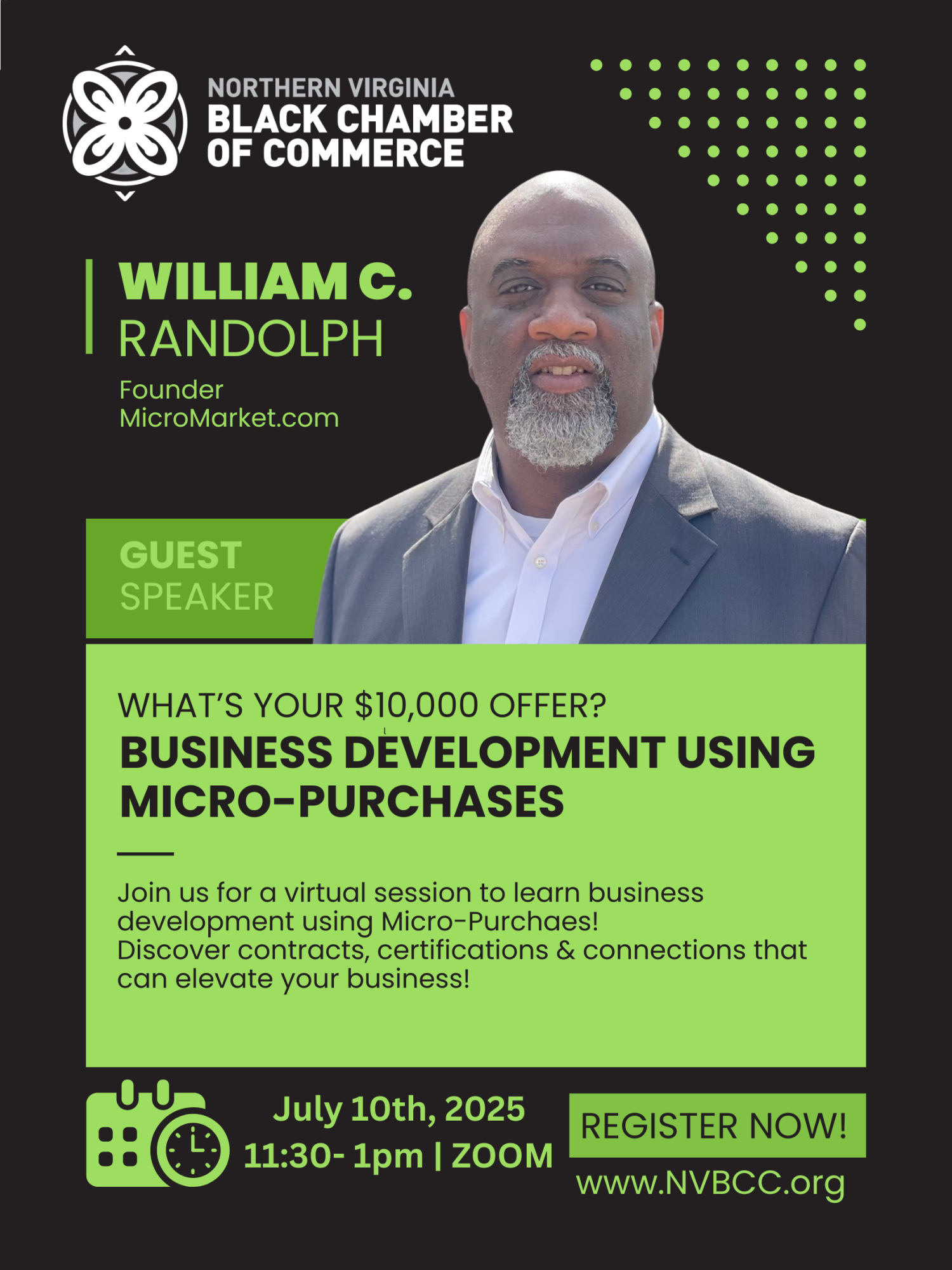 Join NVBCC and guest speaker William C. Randolph, Founder of MicroMarket.com, for a virtual session focused on winning contracts through micro-purchases.