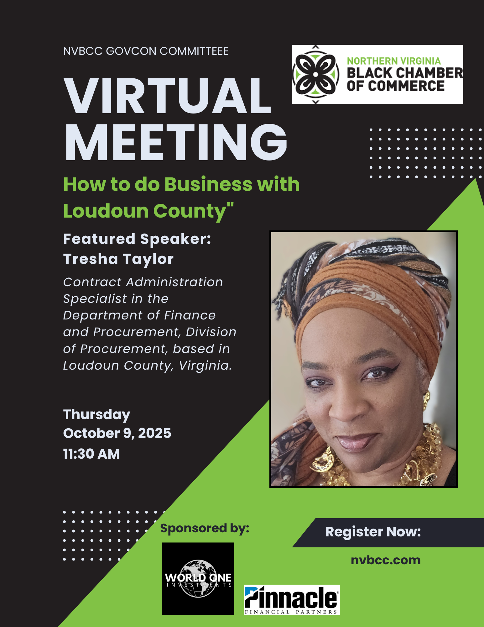 How to Do Business with Loudoun County Join the NVBCC GovCon Committee for a special virtual meeting featuring Tresha Taylor, Contract Administration Specialist in the Department of Finance and Procurement, Division of Procurement for Loudoun County. In this session, you’ll gain direct insight into: How Loudoun County does business with small and diverse vendors Procurement processes and how to become a registered vendor Tips to increase your chances of securing government contracts Whether you’re new to government contracting or ready to scale, this is a can’t-miss opportunity to get actionable strategies and connect with key players.