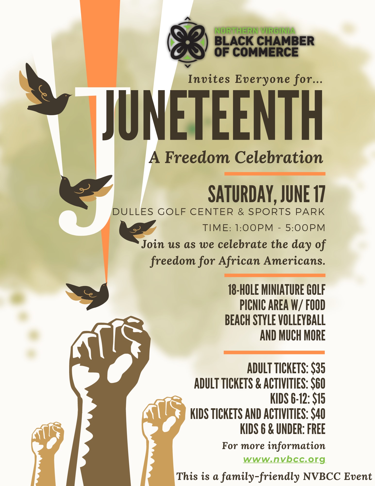 Please bring your family, friends, and colleagues out for our 1st Annual Juneteenth Celebration of Freedom. We are so excited to join as a community at Dulles Golf Center and Sports Park to commemorate the freedoms of enslaved African-Americans in the United States. We will have music, food, activities, games, and more. So leave your business attire and cards at home because it's time for us all to recognize the strides African-Americans have made over the past 158 years.