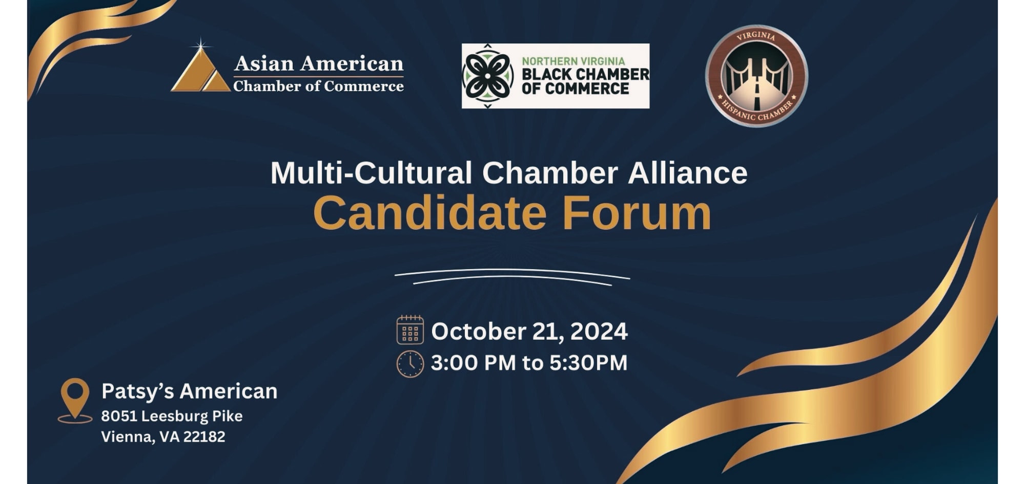Join the Northern Virginia Black Chamber of Commerce and our Multi-Cultural Alliance Partners, The Asian American Chamber of Commerce & the Virginia Hispanic Chamber of Commerce for our Annual Candidates Forum. Participation in this event is crucial as it offers chamber members a unique and empowering opportunity to engage with candidates from both major political parties as we approach the 2024 Presidential, Senatorial, and Congressional Elections. We are honored to host various candidates and key representatives from the Virginia Republican Party and Virginia Democratic Party. This diversity ensures that all voices are heard and represented. Attendees will have the chance to hear directly from the candidates, ask questions, and gain insights into the platforms that will shape our country's and region's future, covering critical topics ranging from national policy to local concerns.