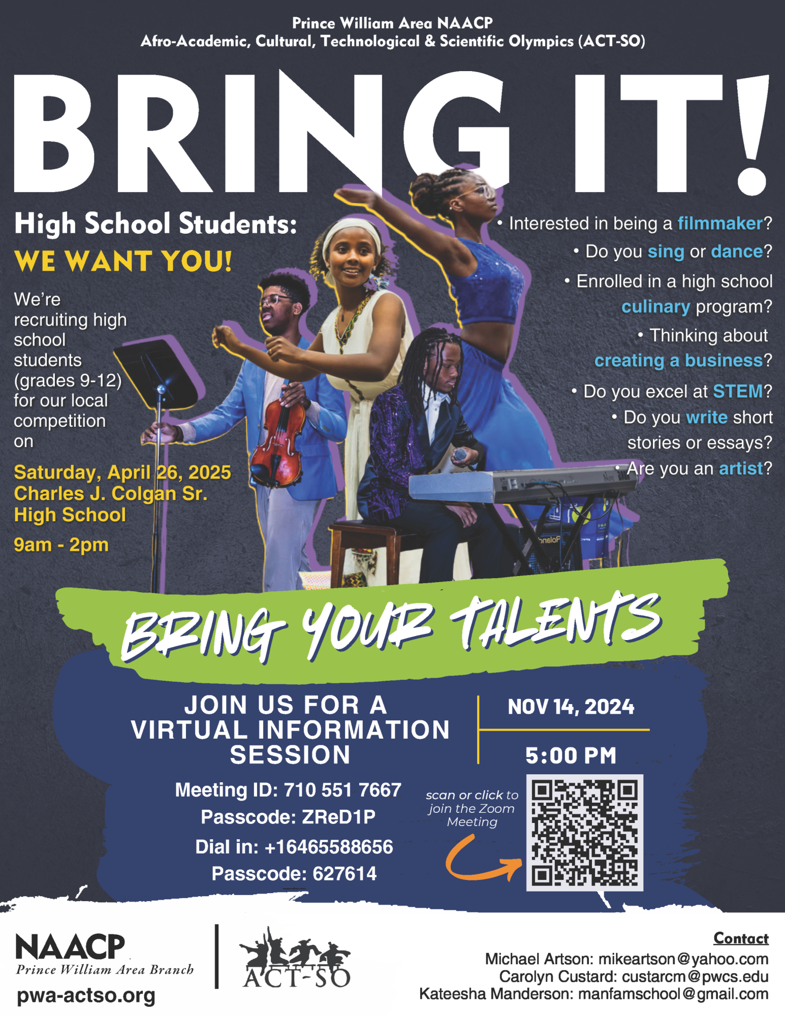 Attend this virtual information session to get the details on the upcoming Afro-Academic, Cultural, Technological & Scientific Olympics (ACT-SO). This event will be at Colgan High School on Saturday, April 26, 2025. ACT-SO consists of 33 competitions covering STEM, humanities, business, performing, visual and culinary arts.