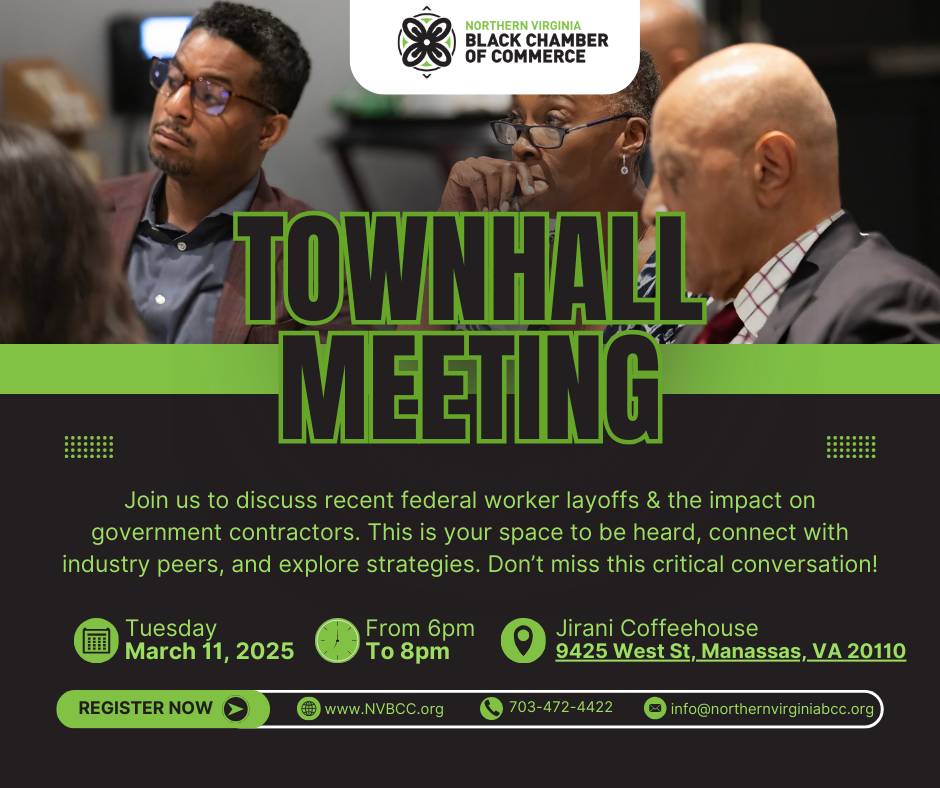 Join the Conversation! The Northern Virginia Black Chamber of Commerce invites you to a Townhall Meeting on Tuesday, March 11, 2025, from 6 PM to 8 PM to discuss the impact of recent federal worker layoffs on government contractors.