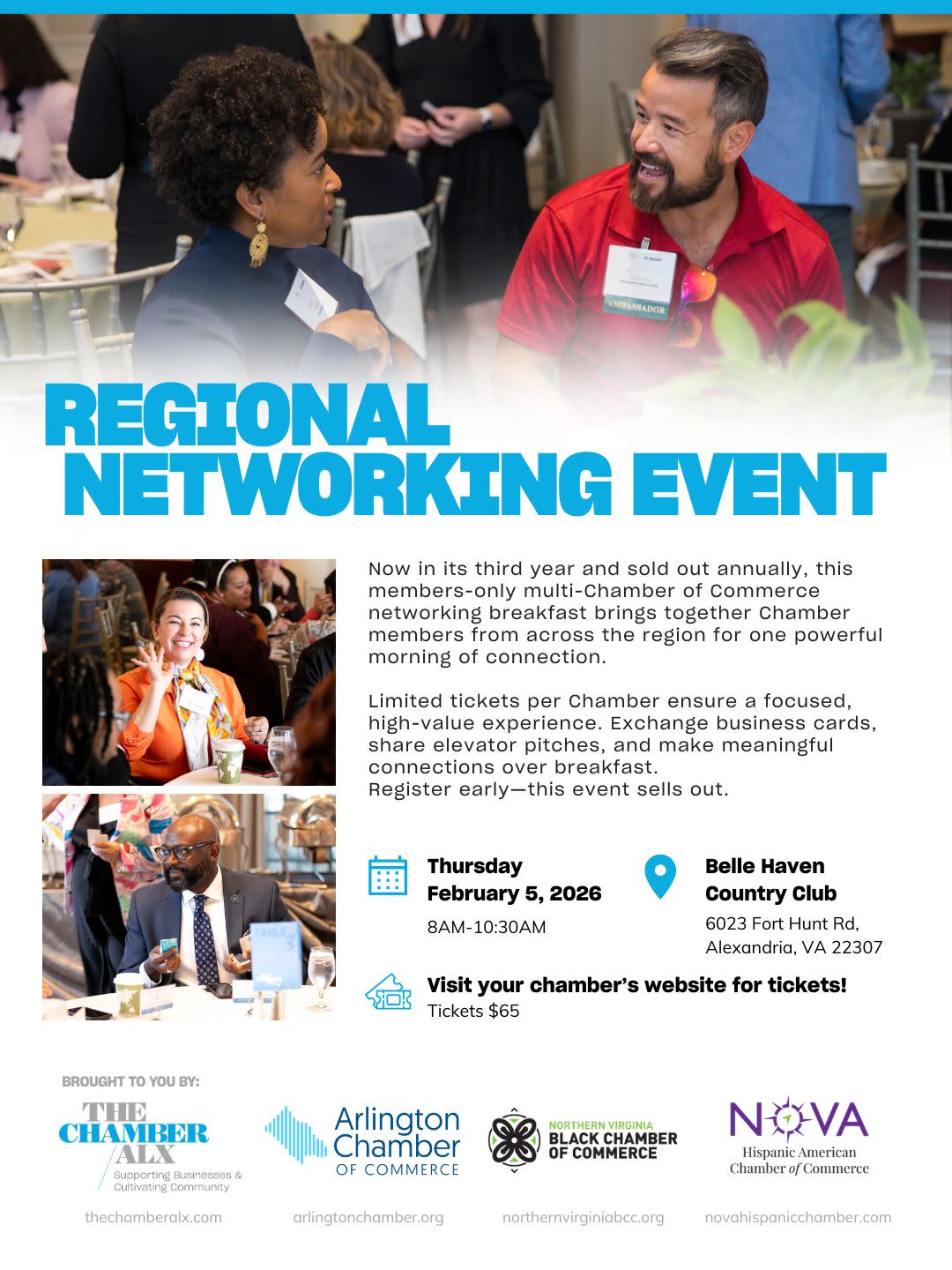 This exclusive regional networking breakfast offers NVBCC members the opportunity to engage with business leaders from chambers across Northern Virginia in a structured and professional setting. The event is designed to encourage meaningful dialogue, thoughtful introductions, and purposeful relationship building among peers. With limited participation per chamber, members benefit from a focused environment that supports quality connections and strategic networking. This experience is well-suited for professionals seeking to strengthen relationships, increase visibility, and engage with fellow leaders across the region.