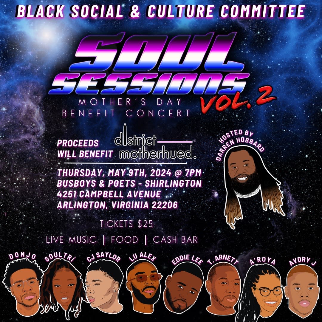 The Black Social & Culture Committee of Fairfax is thrilled to invite you and all the moms in our community to Soul Sessions Vol. 2! This is a Mother's Day Benefit Concert taking place on Thursday, May 9th at 7PM in the Robeson Room of Busboys & Poets of Shirlington. Some of Northern Virginia's best local artists will grace the stage in what is certain to be an evening filled with love and light as we celebrate all the moms! Food is provided along with a cash bar for your enjoyment! This is also a fundraiser that will benefit District MotherHued, a premier organization in the DMV that supports black mothers. Soul Sessions Vol. 2 - LINK TO RSVP
