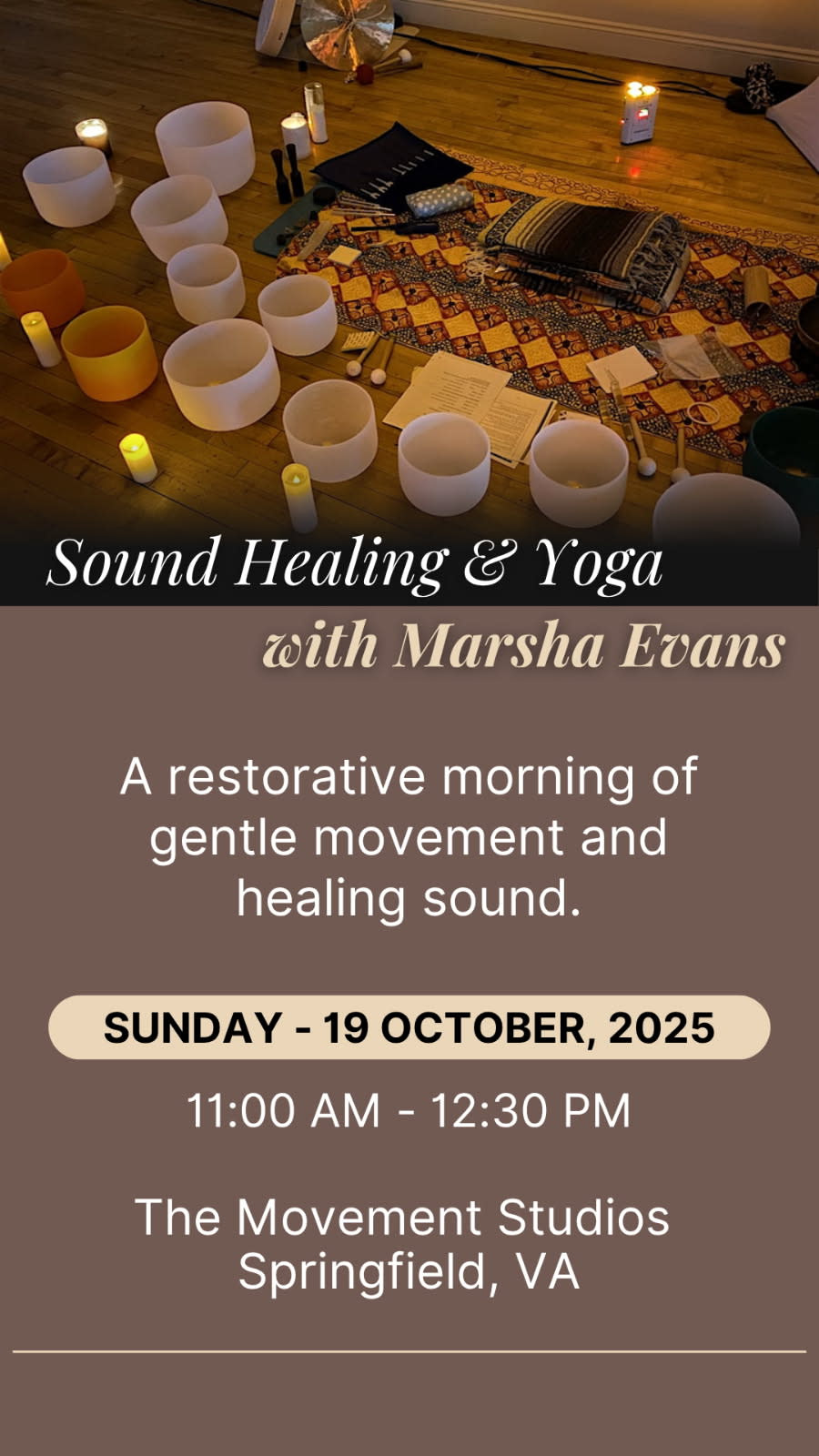 Welcome to Sound Healing and Light Yoga! Join Marsha Listens at The Movement Studios for a rejuvenating experience that combines the healing powers of sound therapy with the gentle practice of yoga.
