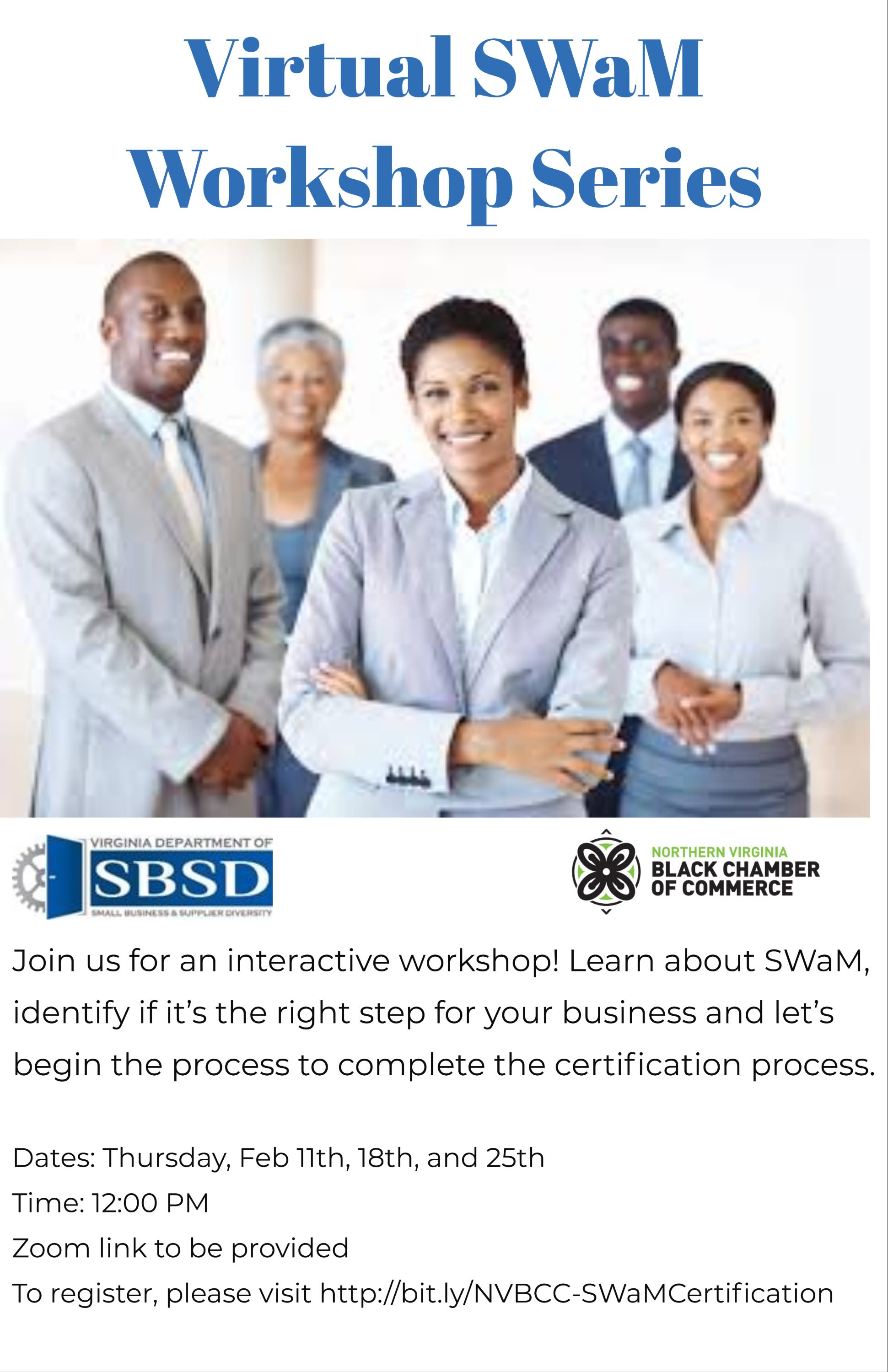 The NVBCC will partner with the Virginia Department Small Business Supplier Diversity. SWaM certification process will be delivered as a program where each session builds upon another. RESERVE Thursday's at noon for 3 weeks of interactive training beginning February 11,2021.