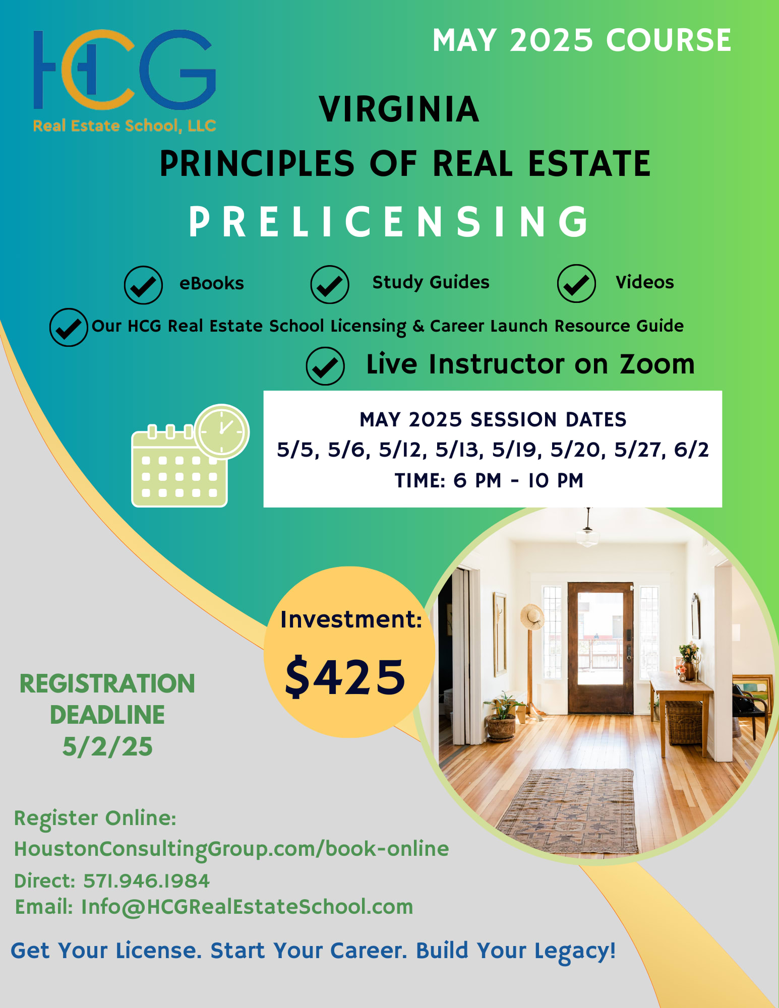 Registration is open for our Virginia Real Estate Pre-licensing Course starting May 5, 2025!