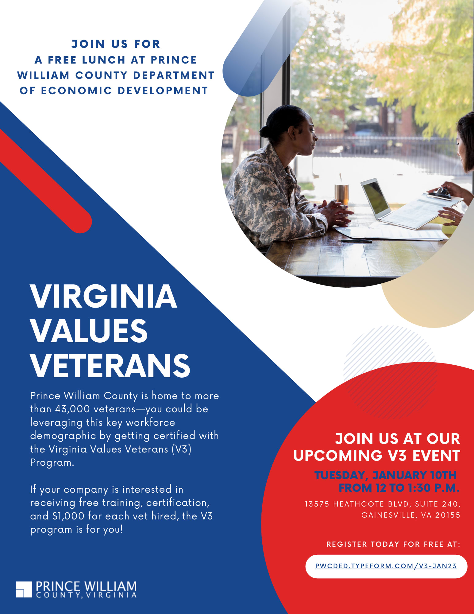 Virginia Values Veterans (V3) Program Join the Prince William County Department of Economic Development for a free lunch and walk away with a Virginia Values Veterans (V3) Program certification and strategies to support veteran employment. and transitioning service members. pwcded.typeform.comImages
